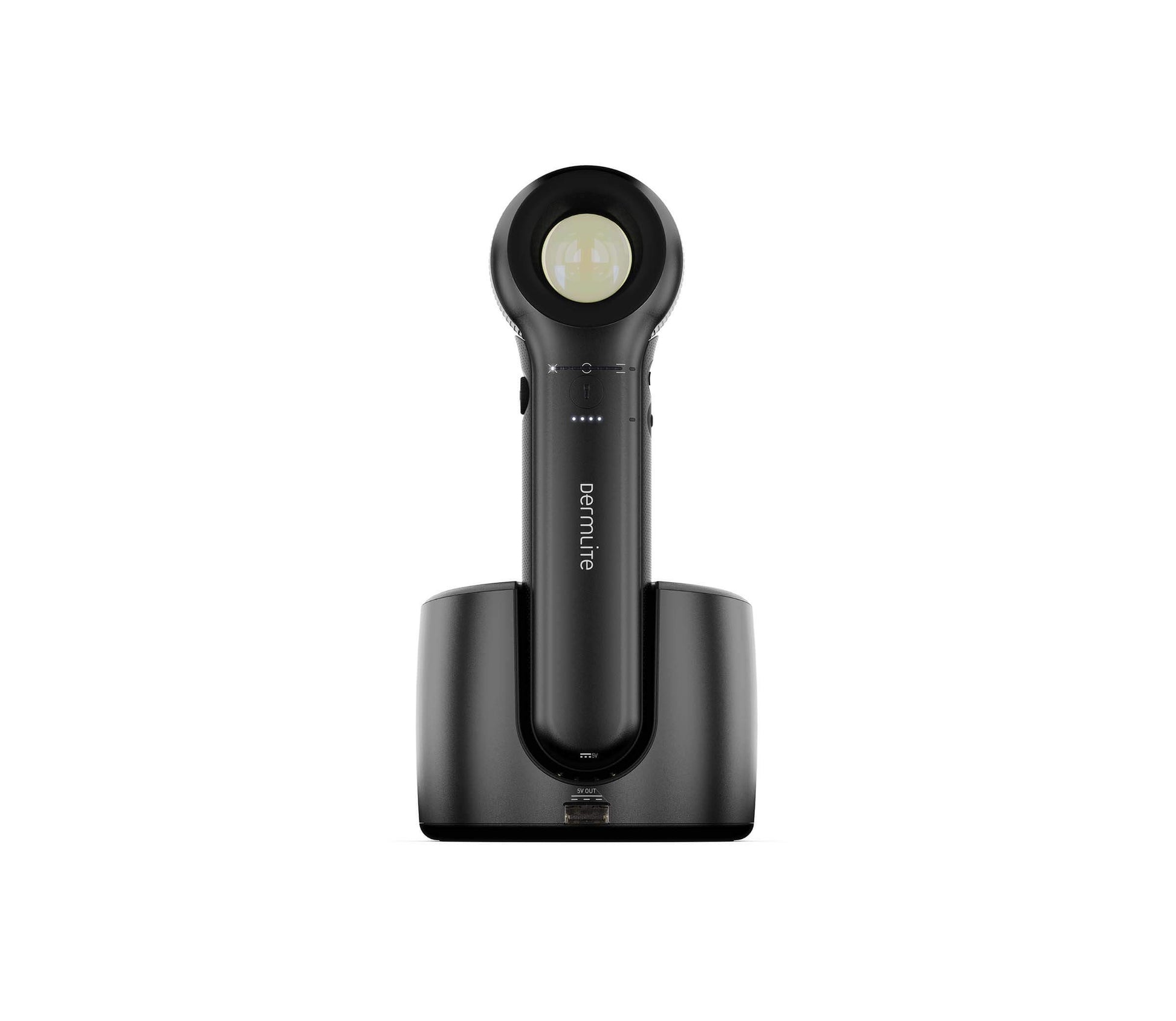 Mellem brug kan den oplades på den medfølgende stationære opladningsbase - som fungerer som hjemmebase til dit IceCap®-tilbehør. Du kan endda oplade en anden DermLite eller din telefon med dens 5V USB-port på forsiden. Eller brug det medfølgende USB-C-kabel på farten; uanset hvad holder DL5's fire-niveau opladningsindikator dig opdateret.