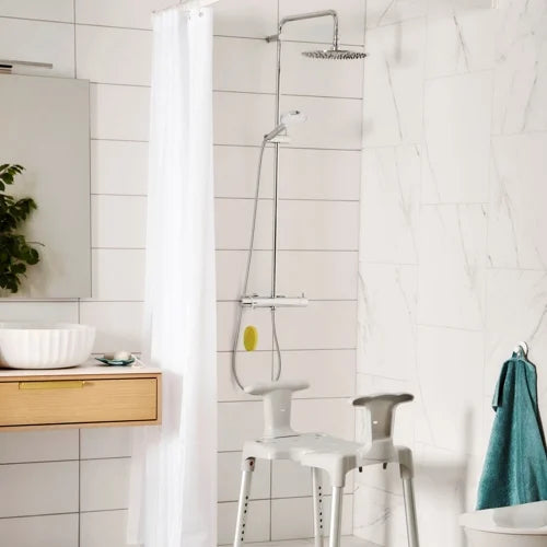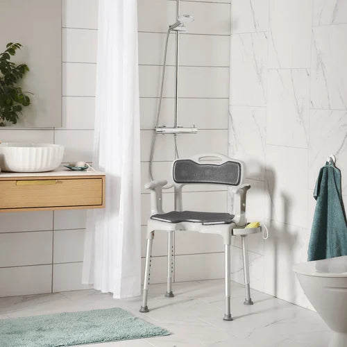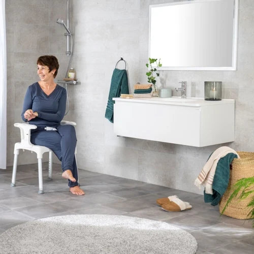 Stolen/skamlen har en stabil konstruktion, der tilpasser sig ujævne overflader. I brusebadet, hvor gulvet hælder mod gulvafløbet, står Swift stabilt på alle fire ben takket være sin indbyggede fleksibilitet. Dyppeskoene giver også et godt greb, og sædets skridsikre mønster giver sikkerhed og stabilitet, vigtige funktioner for at brugeren kan føle sig tryg.