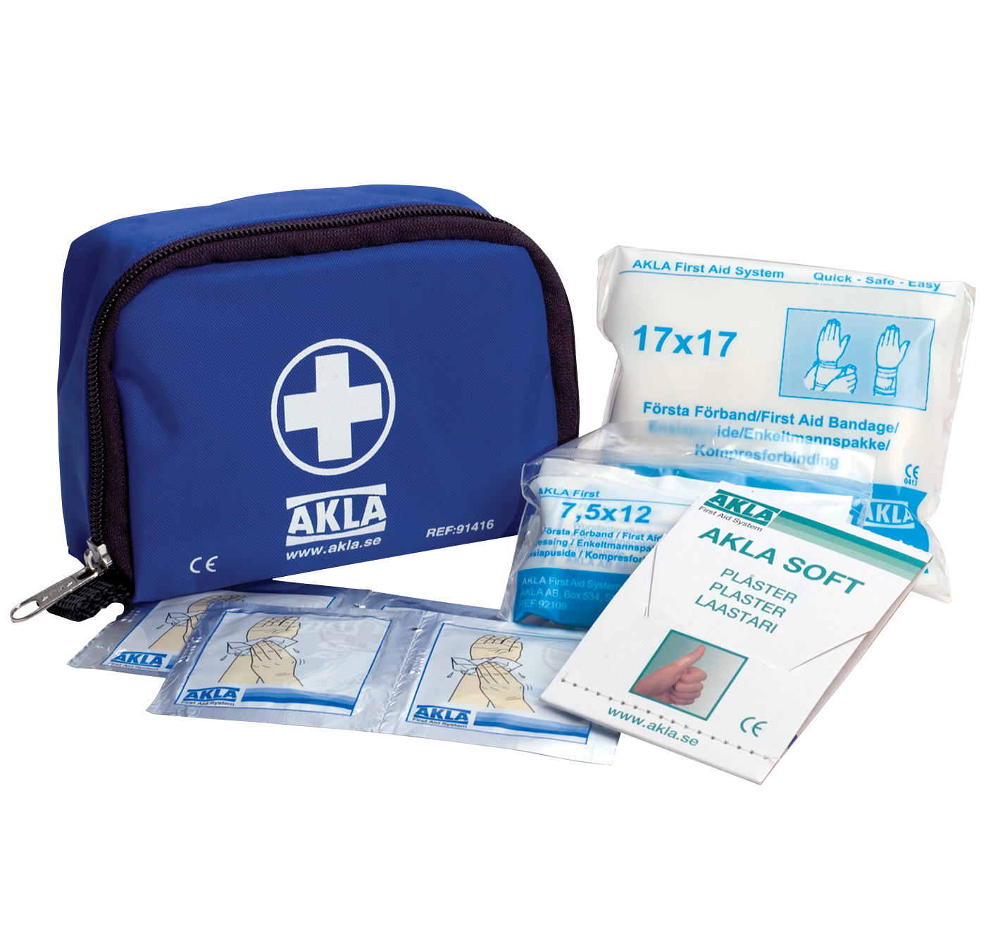 Et praktisk lille fritidskit model "lille" med førstehjælpsprodukter fra AKLA, der er nemt at bære.