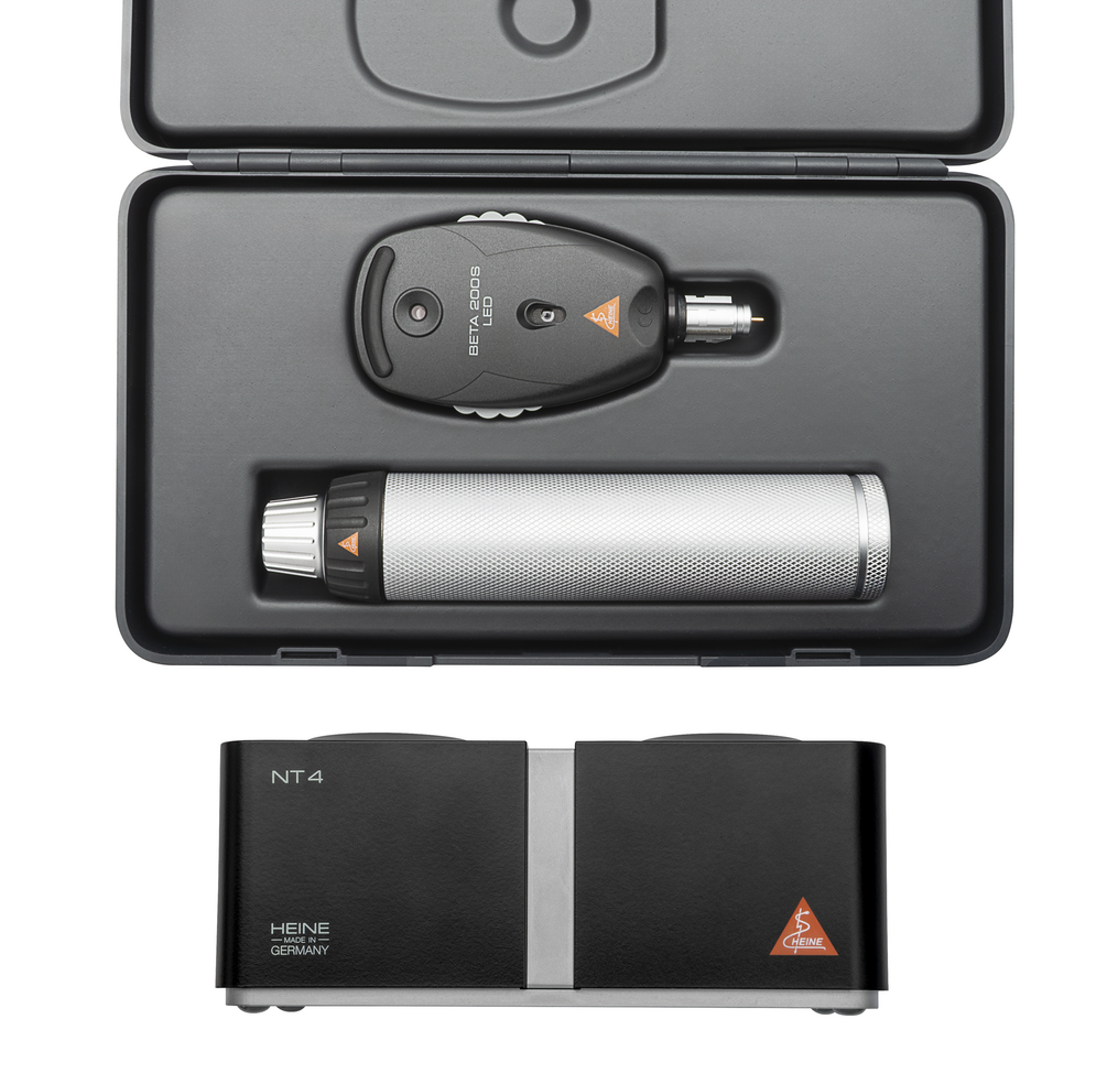 HEINE BETA 200S LED oftalmoskopsættet leveres komplet i en hård kuffert med et genopladeligt BETA 4 NT-håndtag med Li-ion-batteri og en NT4-bordoplader.