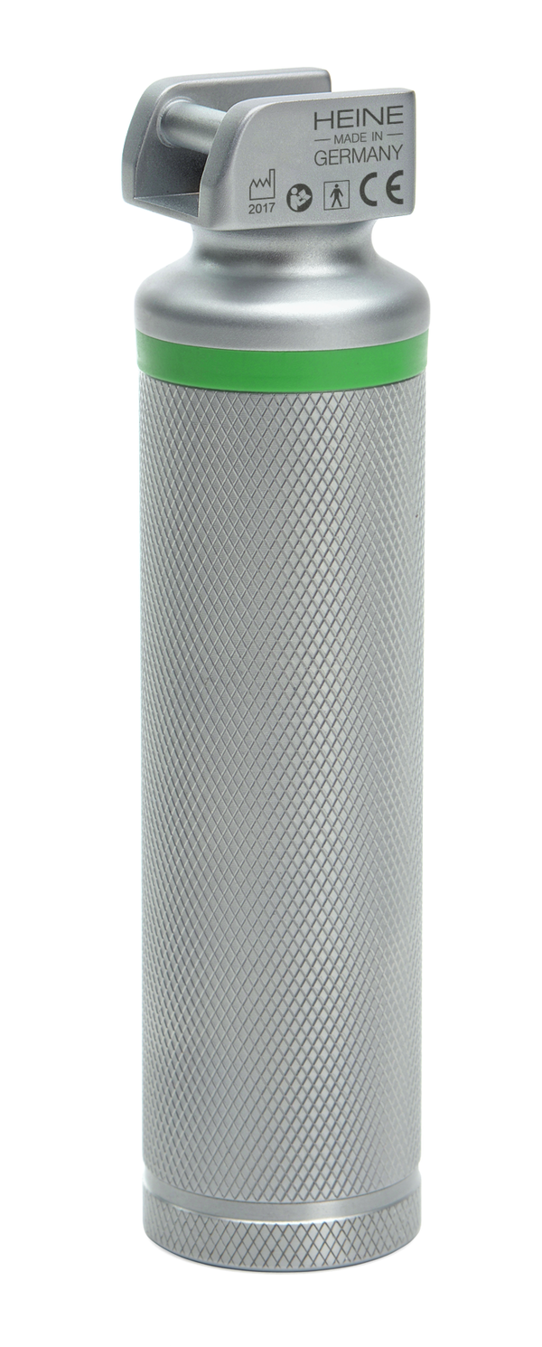HEINE kort genopladeligt FO4 laryngoskophåndtag med LEDHQ-lys af høj kvalitet leveres komplet inklusive genopladeligt Li-ion-batteri integreret i bunddækslet. Håndtaget er kompatibelt med alle FO-laryngoskopblade med grøn standard (ISO 7376). HEINE FO4 laryngoskophåndtaget er kun kompatibelt med HEINE NT4 bordoplader.