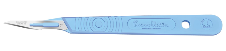 Sterile Swann-Morton skalpeller, individuelt pakket i en æske med 10 stk. Bladet er lavet af rustfrit stål, og håndtaget er lavet af polystyrenplast.