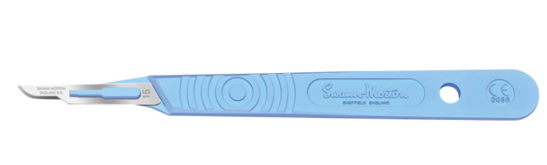 Sterile Swann-Morton skalpeller, individuelt pakket i en æske med 10 stk. Bladet er lavet af rustfrit stål, og håndtaget er lavet af polystyrenplast.