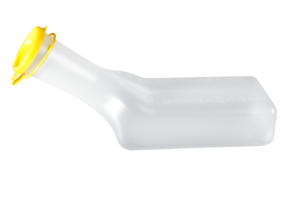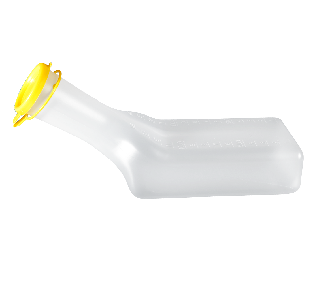 Urinflaske til mænd fremstillet af polypropylen og kan bruges til engangs- eller flergangsbrug. Urinflasken er gradueret i 100 ml intervaller, rummer 1 liter og er udstyret med et tætsluttende låg. Flasken kan modstå temperaturer op til 120 °C og rengøres nemmest med sæbe, vand og desinfektionsmiddel.